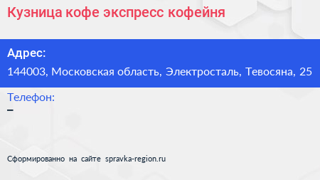 Кузница кофе, экспресс-кофейня по адресу 144003, Московская область, Электросталь, Тевосяна, 25 в дальнейшем Организация, размещена в следующих категориях: