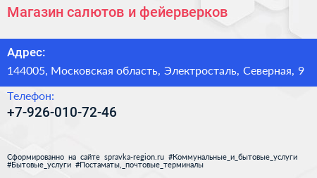 Магазин салютов и фейерверков по адресу 144005, Московская область, Электросталь, Северная, 9 в дальнейшем Организация, размещена в следующих категориях: