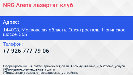 NRG Arena, лазертаг-клуб по адресу 144008, Московская область, Электросталь, Ногинское шоссе, 36Б в дальнейшем Организация, размещена в следующих категориях: