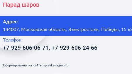 Парад шаров по адресу 144007, Московская область, Электросталь, Победы, 15 к3 в дальнейшем Организация, размещена в следующих категориях: