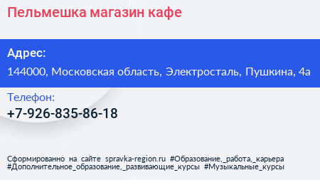 Пельмешка, магазин-кафе по адресу 144000, Московская область, Электросталь, Пушкина, 4а в дальнейшем Организация, размещена в следующих категориях: