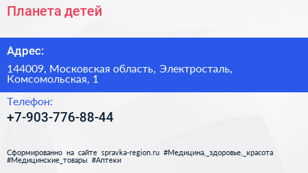 Планета детей по адресу 144009, Московская область, Электросталь, Комсомольская, 1 в дальнейшем Организация, размещена в следующих категориях: