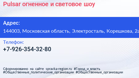 Pulsar, огненное и световое шоу по адресу 144003, Московская область, Электросталь, Корешкова, 2а в дальнейшем Организация, размещена в следующих категориях: