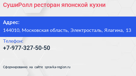 СушиРолл, ресторан японской кухни по адресу 144010, Московская область, Электросталь, Ялагина, 13 в дальнейшем Организация, размещена в следующих категориях: