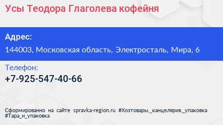 Усы Теодора Глаголева, кофейня по адресу 144003, Московская область, Электросталь, Мира, 6 в дальнейшем Организация, размещена в следующих категориях: