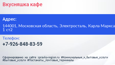 Вкусняшка, кафе по адресу 144001, Московская область, Электросталь, Карла Маркса, 1 ст2 в дальнейшем Организация, размещена в следующих категориях: