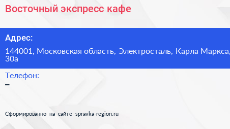 Восточный экспресс, кафе по адресу 144001, Московская область, Электросталь, Карла Маркса, 30а в дальнейшем Организация, размещена в следующих категориях: