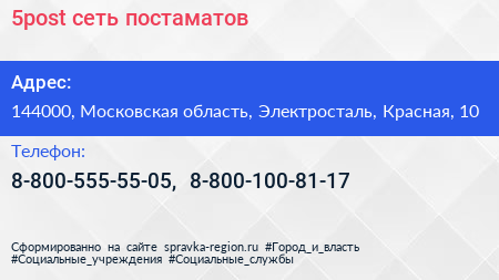 5post, сеть постаматов по адресу 144000, Московская область, Электросталь, Красная, 10 в дальнейшем Организация, размещена в следующих категориях: