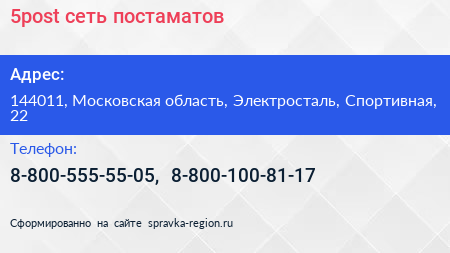 5post, сеть постаматов по адресу 144011, Московская область, Электросталь, Спортивная, 22 в дальнейшем Организация, размещена в следующих категориях: