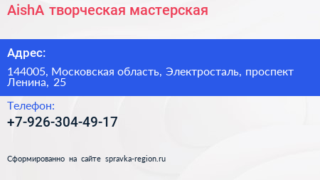 AishA, творческая мастерская по адресу 144005, Московская область, Электросталь, проспект Ленина, 25 в дальнейшем Организация, размещена в следующих категориях: