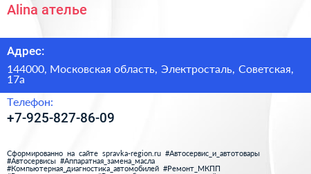 Alina, ателье по адресу 144000, Московская область, Электросталь, Советская, 17а в дальнейшем Организация, размещена в следующих категориях: