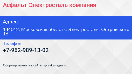 Асфальт-Электросталь, компания по адресу 144012, Московская область, Электросталь, Островского, 16 в дальнейшем Организация, размещена в следующих категориях: