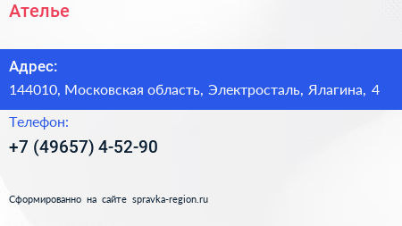 Ателье по адресу 144010, Московская область, Электросталь, Ялагина, 4 в дальнейшем Организация, размещена в следующих категориях: