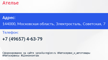 Ателье по адресу 144000, Московская область, Электросталь, Советская, 7 в дальнейшем Организация, размещена в следующих категориях: