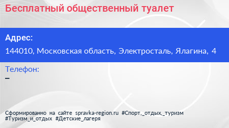 Бесплатный общественный туалет по адресу 144010, Московская область, Электросталь, Ялагина, 4 в дальнейшем Организация, размещена в следующих категориях: