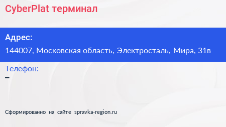 CyberPlat, терминал по адресу 144007, Московская область, Электросталь, Мира, 31в в дальнейшем Организация, размещена в следующих категориях:
