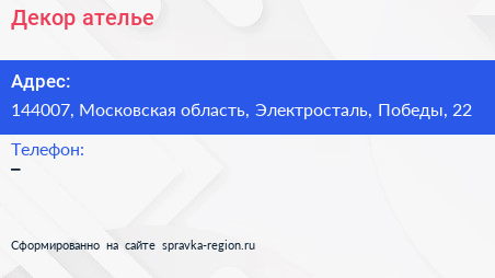 Декор, ателье по адресу 144007, Московская область, Электросталь, Победы, 22 в дальнейшем Организация, размещена в следующих категориях:
