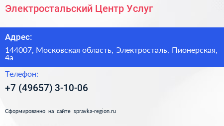 Электростальский Центр Услуг по адресу 144007, Московская область, Электросталь, Пионерская, 4а в дальнейшем Организация, размещена в следующих категориях: