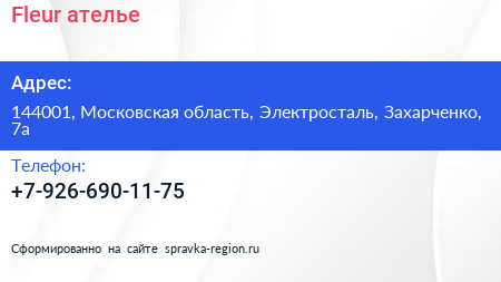 Fleur, ателье по адресу 144001, Московская область, Электросталь, Захарченко, 7а в дальнейшем Организация, размещена в следующих категориях: