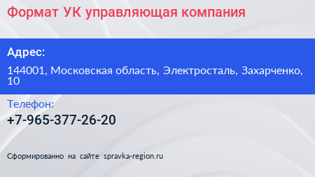 Формат-УК, управляющая компания по адресу 144001, Московская область, Электросталь, Захарченко, 10 в дальнейшем Организация, размещена в следующих категориях: