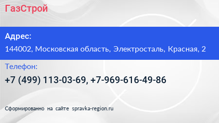 ГазСтрой по адресу 144002, Московская область, Электросталь, Красная, 2 в дальнейшем Организация, размещена в следующих категориях:
