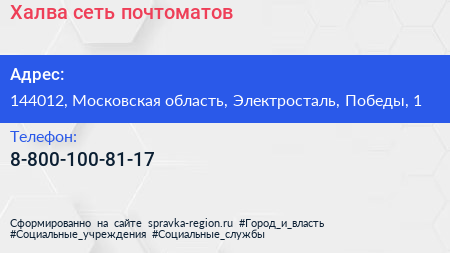 Халва, сеть почтоматов по адресу 144012, Московская область, Электросталь, Победы, 1 в дальнейшем Организация, размещена в следующих категориях: