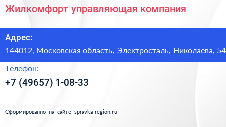 Жилкомфорт, управляющая компания по адресу 144012, Московская область, Электросталь, Николаева, 54 в дальнейшем Организация, размещена в следующих категориях: