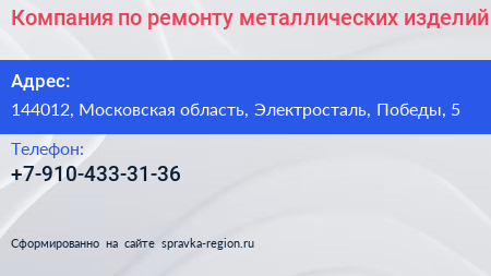 Компания по ремонту металлических изделий по адресу 144012, Московская область, Электросталь, Победы, 5 в дальнейшем Организация, размещена в следующих категориях: