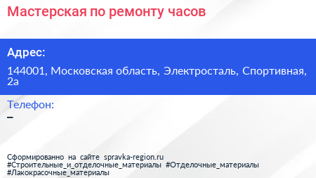 Мастерская по ремонту часов по адресу 144001, Московская область, Электросталь, Спортивная, 2а в дальнейшем Организация, размещена в следующих категориях: