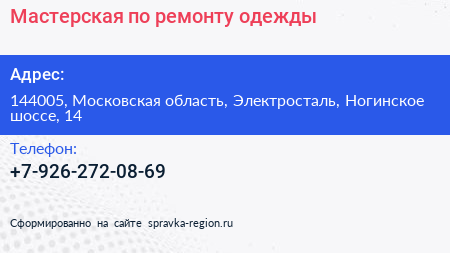 Мастерская по ремонту одежды по адресу 144005, Московская область, Электросталь, Ногинское шоссе, 14 в дальнейшем Организация, размещена в следующих категориях: