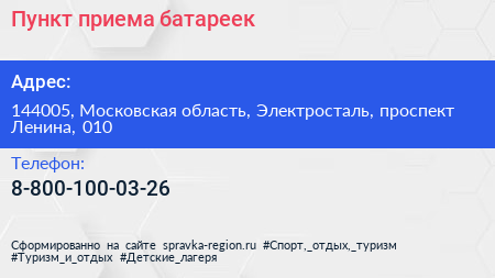 Пункт приема батареек по адресу 144005, Московская область, Электросталь, проспект Ленина, 010 в дальнейшем Организация, размещена в следующих категориях: