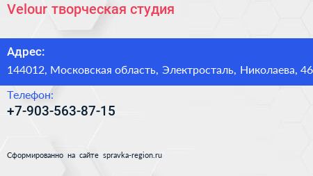 Velour, творческая студия по адресу 144012, Московская область, Электросталь, Николаева, 46 в дальнейшем Организация, размещена в следующих категориях: