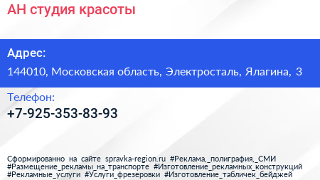AH, студия красоты по адресу 144010, Московская область, Электросталь, Ялагина, 3 в дальнейшем Организация, размещена в следующих категориях: