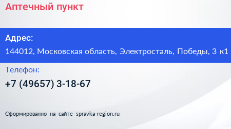 Аптечный пункт по адресу 144012, Московская область, Электросталь, Победы, 3 к1 в дальнейшем Организация, размещена в следующих категориях: