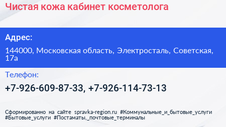 Чистая кожа, кабинет косметолога по адресу 144000, Московская область, Электросталь, Советская, 17а в дальнейшем Организация, размещена в следующих категориях: