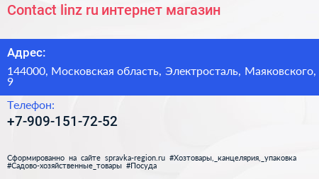 Contact-linz.ru, интернет-магазин по адресу 144000, Московская область, Электросталь, Маяковского, 9 в дальнейшем Организация, размещена в следующих категориях: