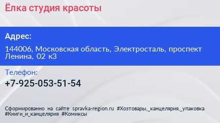 Ёлка, студия красоты по адресу 144006, Московская область, Электросталь, проспект Ленина, 02 к3 в дальнейшем Организация, размещена в следующих категориях: