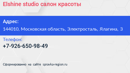 Elshine studio, салон красоты по адресу 144010, Московская область, Электросталь, Ялагина, 3 в дальнейшем Организация, размещена в следующих категориях: