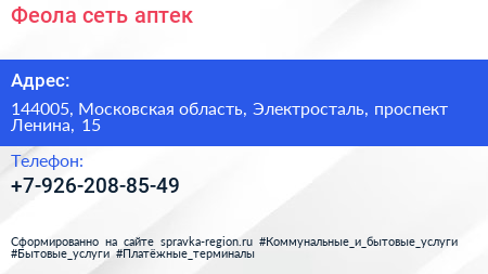 Феола, сеть аптек по адресу 144005, Московская область, Электросталь, проспект Ленина, 15 в дальнейшем Организация, размещена в следующих категориях: