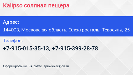Kalipso, соляная пещера по адресу 144003, Московская область, Электросталь, Тевосяна, 25 в дальнейшем Организация, размещена в следующих категориях: