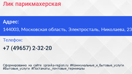 Лик, парикмахерская по адресу 144003, Московская область, Электросталь, Николаева, 23 в дальнейшем Организация, размещена в следующих категориях: