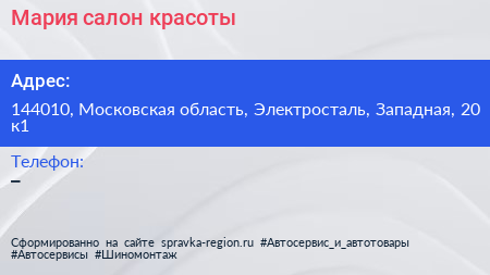 Мария, салон красоты по адресу 144010, Московская область, Электросталь, Западная, 20 к1 в дальнейшем Организация, размещена в следующих категориях: