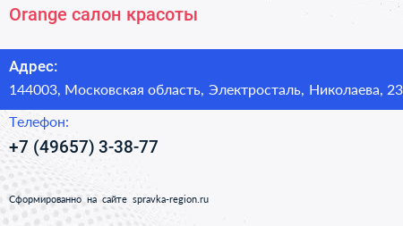 Orange, салон красоты по адресу 144003, Московская область, Электросталь, Николаева, 23 в дальнейшем Организация, размещена в следующих категориях: