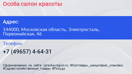 Особа, салон красоты по адресу 144000, Московская область, Электросталь, Первомайская, 46 в дальнейшем Организация, размещена в следующих категориях: