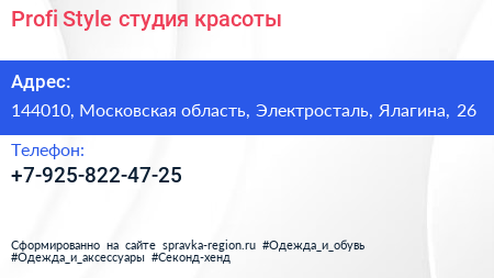 Profi Style, студия красоты по адресу 144010, Московская область, Электросталь, Ялагина, 26 в дальнейшем Организация, размещена в следующих категориях: