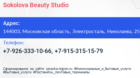 Sokolova Beauty Studio по адресу 144003, Московская область, Электросталь, Николаева, 25 в дальнейшем Организация, размещена в следующих категориях: