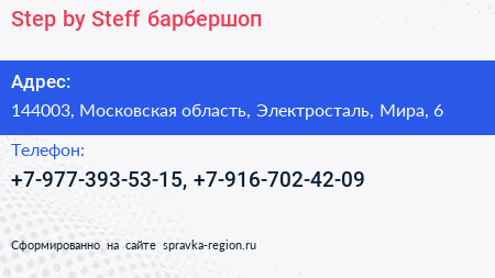 Step by Steff, барбершоп по адресу 144003, Московская область, Электросталь, Мира, 6 в дальнейшем Организация, размещена в следующих категориях: