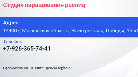 Студия наращивания ресниц по адресу 144007, Московская область, Электросталь, Победы, 15 к1 в дальнейшем Организация, размещена в следующих категориях: