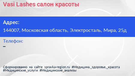 Vasi & Lashes, салон красоты по адресу 144007, Московская область, Электросталь, Мира, 25д в дальнейшем Организация, размещена в следующих категориях: