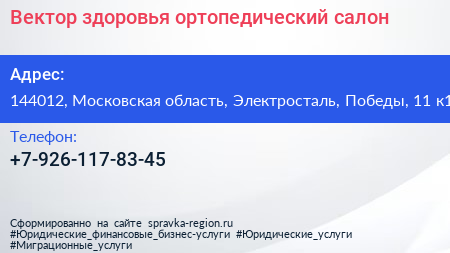 Вектор здоровья, ортопедический салон по адресу 144012, Московская область, Электросталь, Победы, 11 к1 в дальнейшем Организация, размещена в следующих категориях: